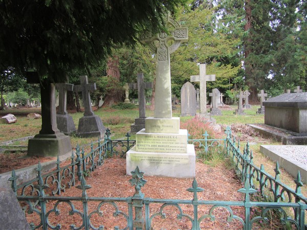 Headstone reads "In Loving memory of Ross L Mangles V.C. Late Bengal Civil Service Born April 14th 1833 Died Feb 28th 1905