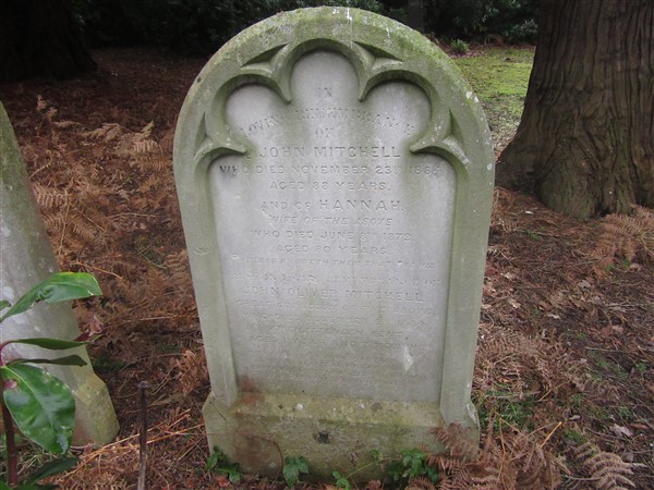 Headstone reads "In loving remembrance of John Mitchell who died Nov 23rd 1884 aged 88 years and of Hannah wife of the above who died Jun 8th 1879 aged 80 years The Lord knoweth them that are his Also in loving remembrance of John Oliver Mitchell great grandson of the above who died Dec 9th 1884 at Chattenden Kent aged 1 year and 7 months They are gone how we miss them, grieving hearts alone can tell, Earth has lost them Jesus gains them, Jesus has done all things well."