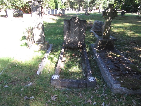 Headstone reads "In Treasured and Joyful Memory of Barbara Pavia nee Fulk (24th December 1908) darling wife of Cyril V F Pavia and devoted mother of Geoffrey, Alan, Mary and Michael who laft all so suddenly December 11th 1973 when she was there true happiness