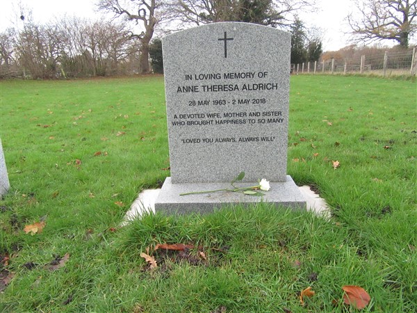 Headstone reads "In loving memory of Anne Theresa Aldrich 28 May 1963 - 2 May 2018