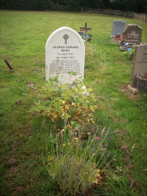 Headstone reads "Alfred Edward Bews 17th April 1942 - 29th August 2012 An honest man here lies at rest, As e’er God with His image blest: The friend of man, the friend of truth; The friend of age, and guide of youth: Few hearts like his, with virtue warm’d, Few heads with knowledge so inform’d: If there’s another world, he lives in bliss; If there is none, he made the best of this. Robert Burns"