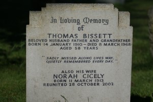 Headstone reads "'In Loving Memory of Thomas BISSETT, beloved husband, father & grandfather 14 Jan 1910 - 8 Mar 1968, 58. Also his wife Norah Cicely BISSETT 11 Mar 1913 - 28 Oct 2002"