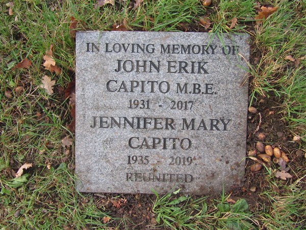 Headstone reads "In loving memory of John Erik Capito M.B.E. 1931 - 2017 Jennifer Mary Capito 1935 - 2019 Reunited"