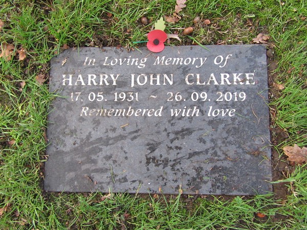 Headstone reads "In loving memory of Harry John Clarke 17.05.1931 - 26.09.2019 Remembered with love"