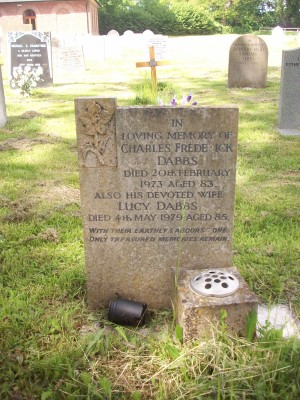 Headstone reads "In loving memory of Charles Frederick DABBS died 20 February 1973 aged 83. Also devoted wife Lucy DABBS died 4 May 1979 aged 85 With their earthly labours done, only treasured memories remain"