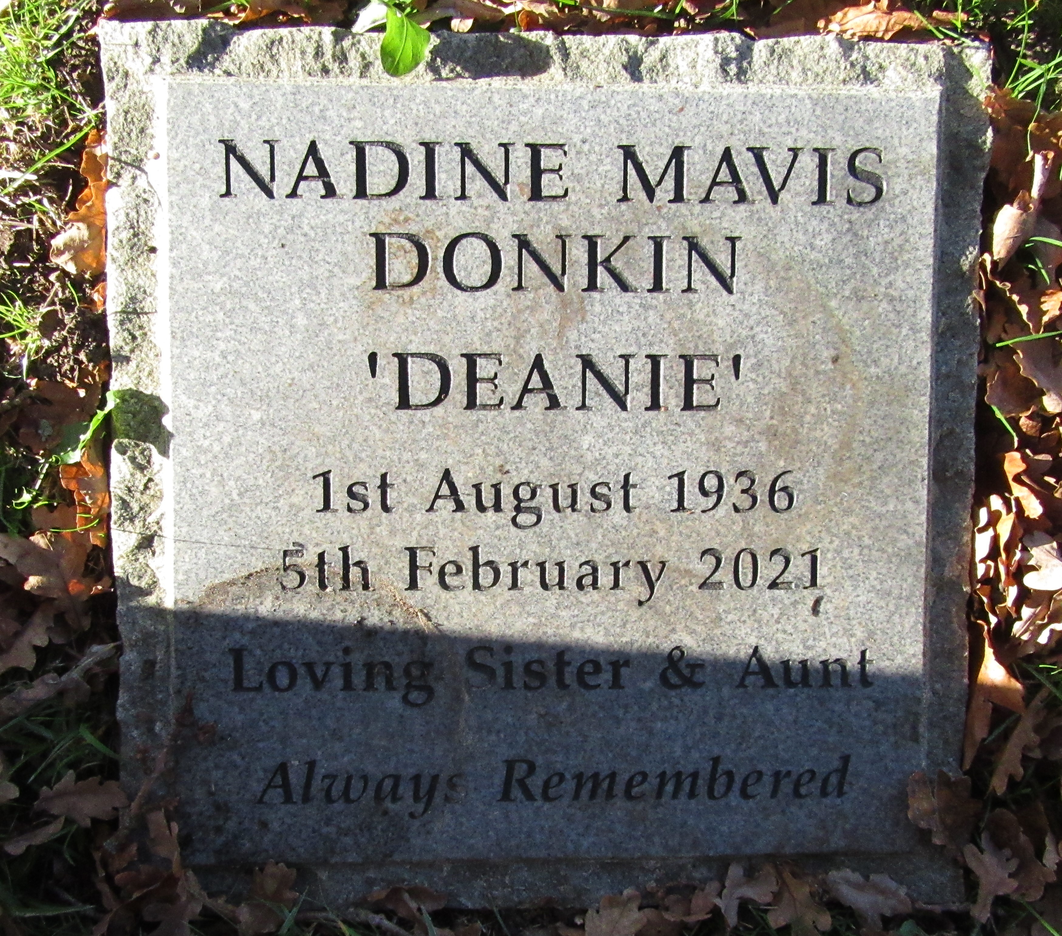 Headstone reads "Nadine Mavis Donkin "Deanie" 1st Aug 1936 - 5 Feb 2021