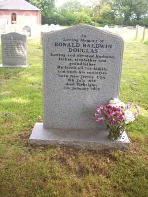Headstone reads "In loving memory of Ronald Baldwin Douglas loving and devoted husband, father, and stepfather and grandfather he loved all his family and both his countries. Born New Jersey USA 8th July 1928 died Pirbright 5th January 2008"