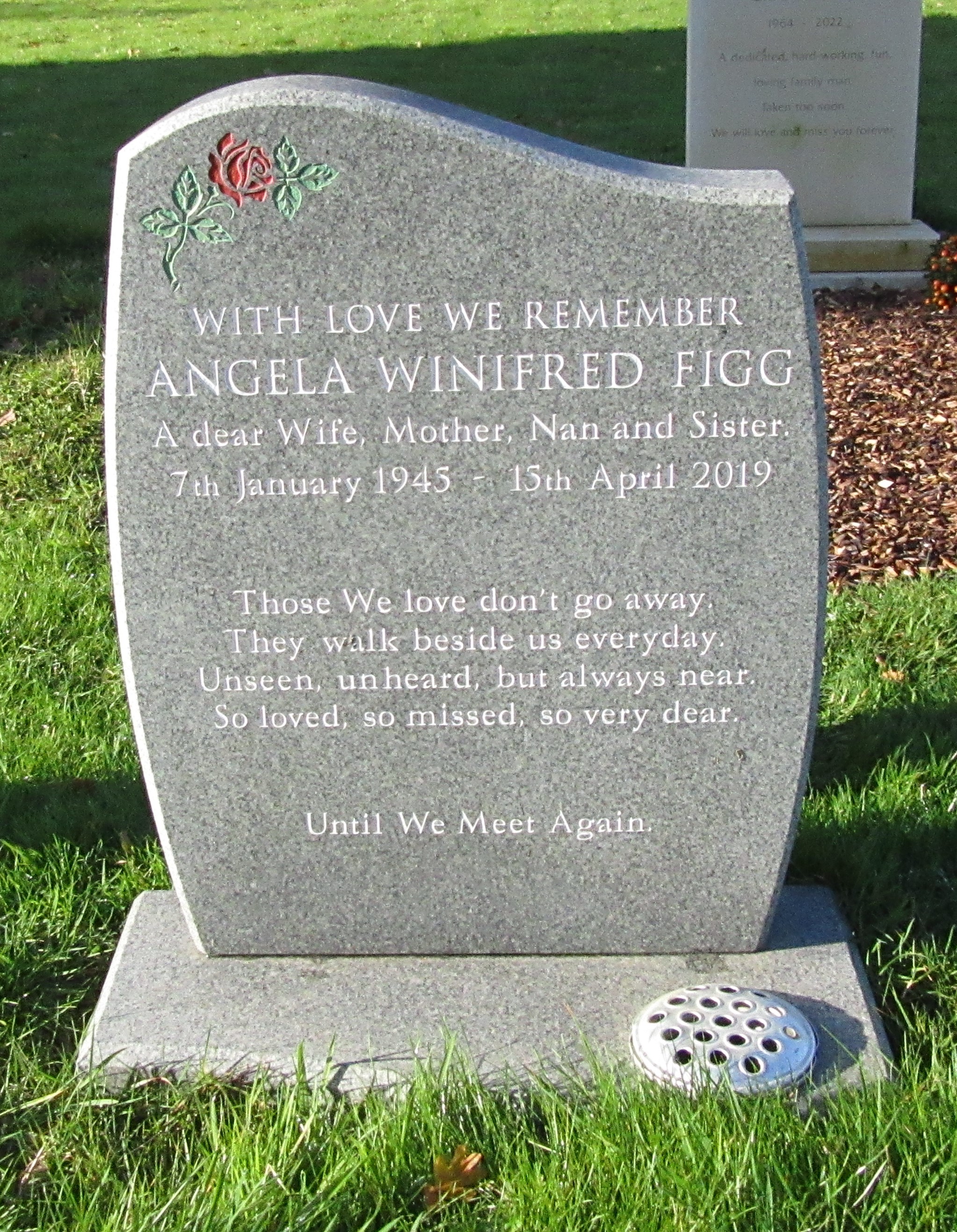 Headstone reads "With love we remember Angela Winifred Figg a dear wife, mother, Nan, and sister