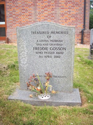 Headstone reads "Treasure memories of a loving husband dad & grandad Freddie GOSSON who passed away 3rd Apr 2002 Always in our thoughts"