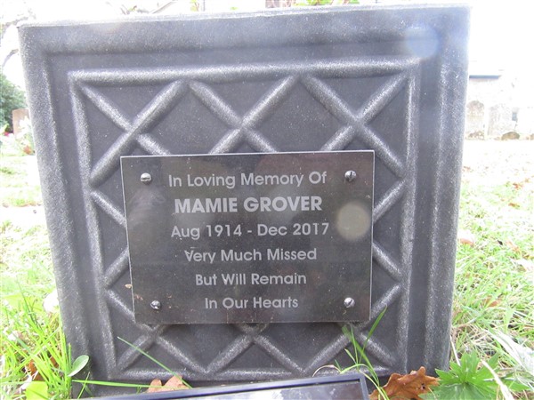 Headstone reads "In Loving Memory of Mamie Grover Aug 1914 - Dec 2017 Very much missed but will remain in our hearts"