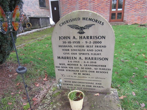 Headstone reads "Cherished memories John A HARRISON 30.10.1938 - 9.2.2000. Husband, father, best friend Your strength and love give our spirits flight. Maureen A HARRISON 3.6.1944 - 6.4.2018 Wife, Mother and Grandmother Too soon you left so kind ... so fearless your strength lifts our resolve to be more. You will be the sunshine in our universe. With unconditional and Eternal love in our hearts. This is not goodbye"