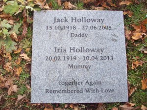 Headstone reads "Jack HOLLOWAY 15.10.1918 - 27.06.2005 Daddy Iris Holloway 20.02 1919 - 10.04 2013 Mummy Together again remembered with love"