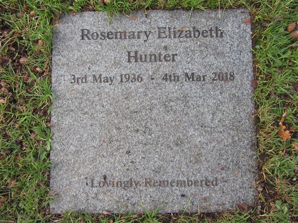 Headstones reads "Rosemary Elizabeth Hunter 3 May 1936 - 4 Mar 2018 Lovingly Remembered"