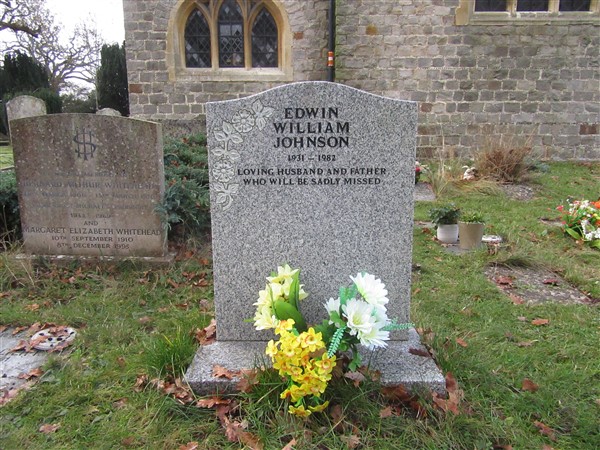 Headstone reads "Edwin William JOHNSON 1931 - 1982. Loving husband and father who will be sadly missed"