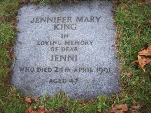 Headstone reads "Jennifer Mary King in loving memory of dear Jenni who died 24th April 1991 aged 47"