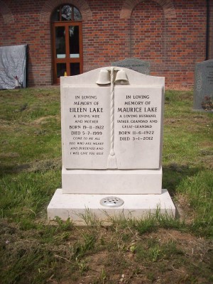 Headstone reads "In Loving Memory of Eileen LAKE A loving wife and mother Born 19-11-1922 Died 5-7-1999. Come to me all you who are weary and burdened and I will give you rest. In Loving Memory of Maurice Lake a loving husband, father, Grandad and Great-Grandad Born 11-6-1922 Died 3-1-2012"