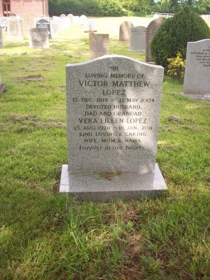 Headstone reads "In Loving Memory of Victor Matthew LOPEZ 13 Dec 1918 - 21 May 2004, devoted husband, Dad & grandad. Vera Eileen LOPEZ 25 Aug 1926 - 19 Jan 2011 Kind loving and caring wife, mum and Nana Forever in our hearts"