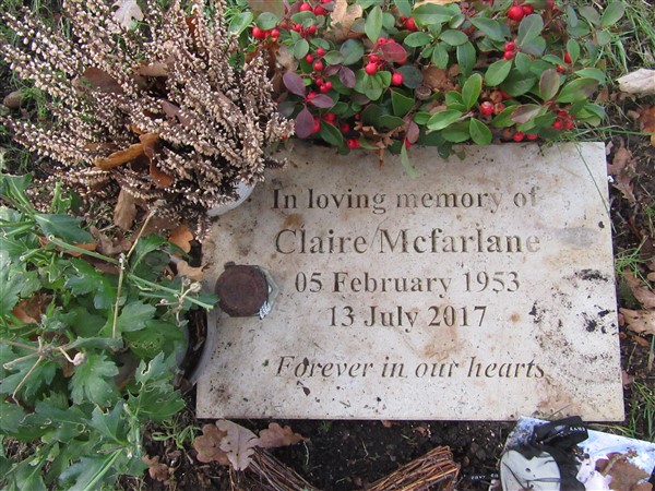 Headstone reads "In loving memory of Claire McFarlane 5 February 1953 - 13 Jul 2017 Forever in our hearts"