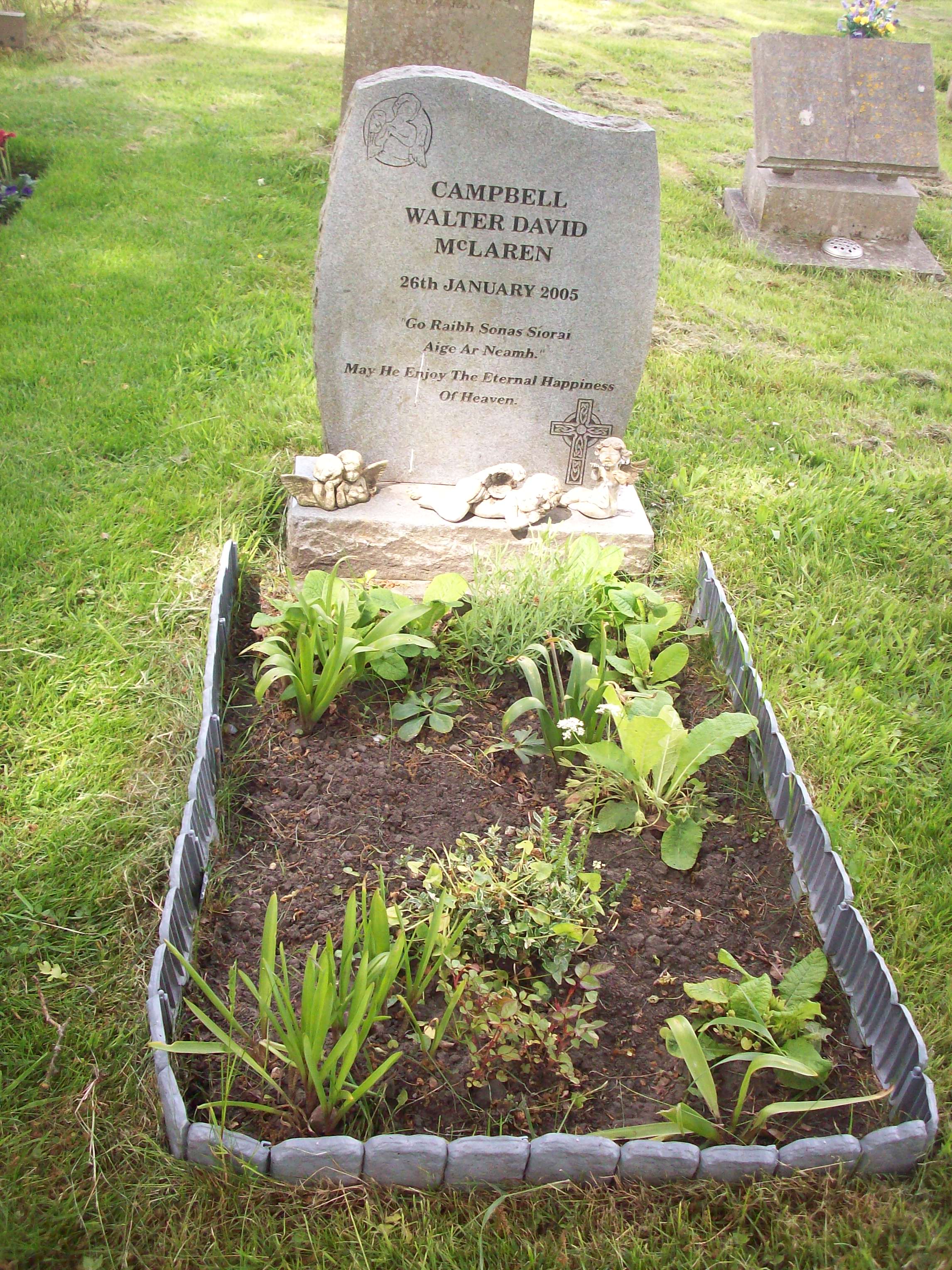 Headstone reads "Campbell Walter David McLAREN 26 January 2005 Go Raibh Sonas Siorai Aige Ar Neamh May he enjoy the eternal happiness of Heaven"