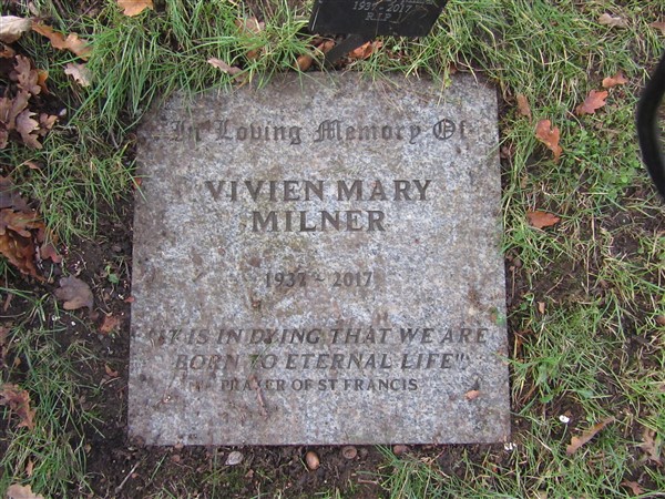 Headstone reads "In Loving Memory of Vivien Mary Milner 1937 - 2017