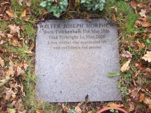 Headstone reads "Walter Joseph Morphew born Twickenham 17th May 1926 died Pirbright 1st May 2000 A free thinker who approached life with confidence and passion"