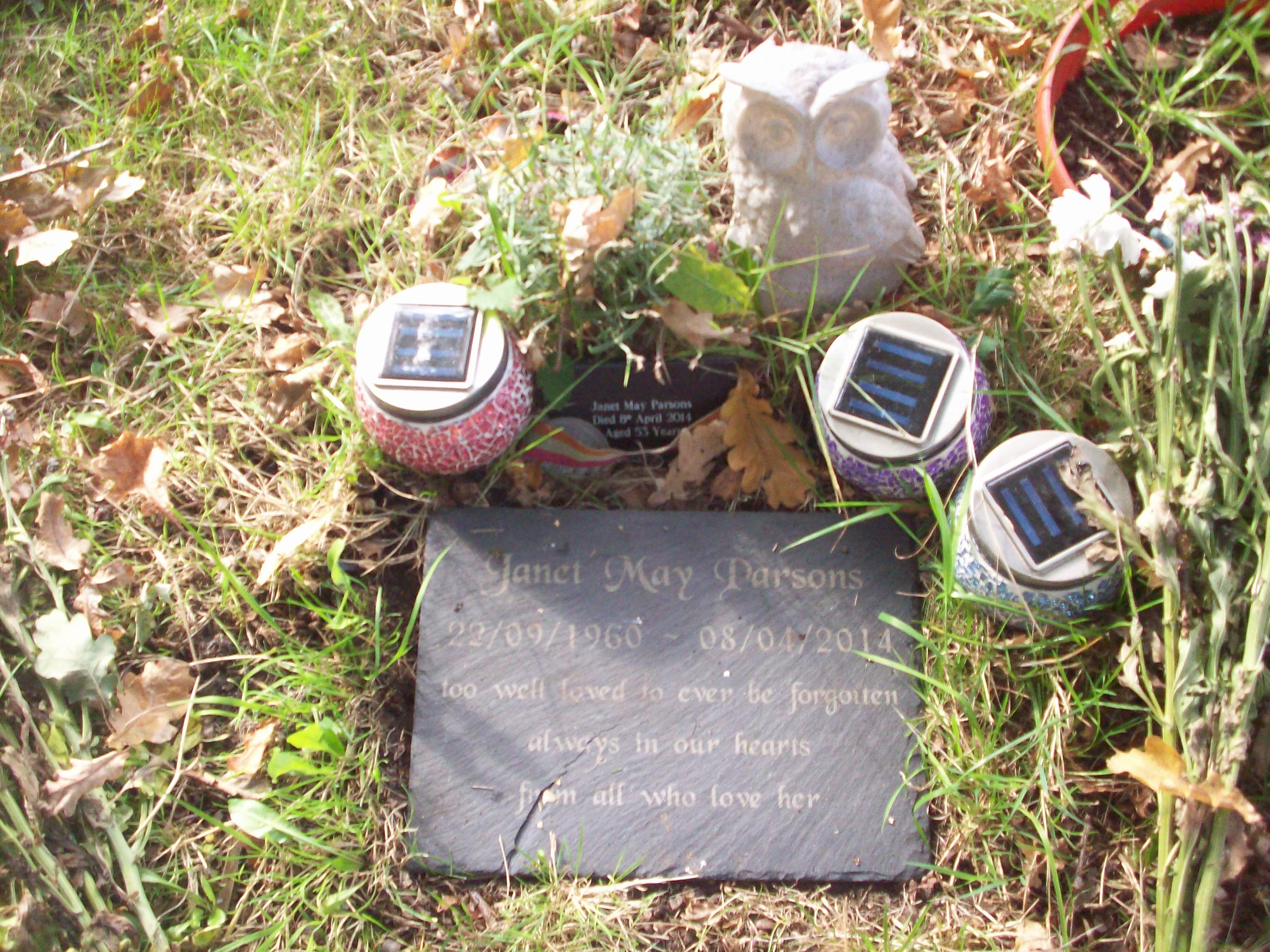 Headstone reads "Janet May Parsons died 8th April 2014 aged 53 years"