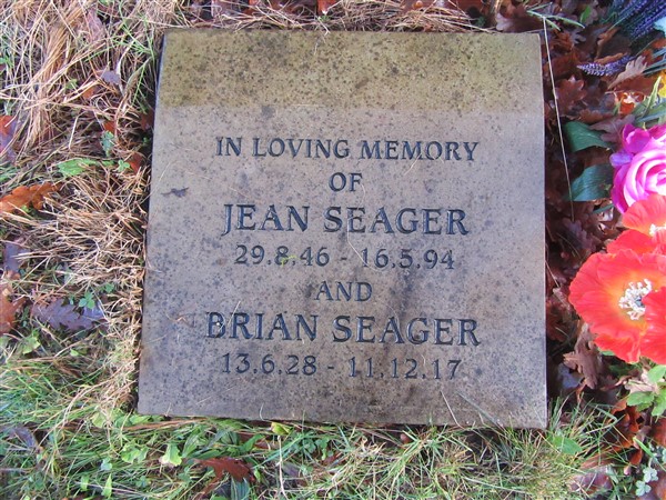 Headstone reads "In loving memory of Jean Seager 29.8.1946 - 16.5.1994 and Brian Seager 13.6.1928 - 11.12.2017"