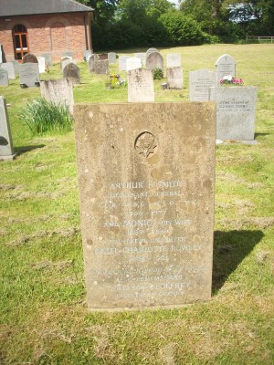 Headstone reads "Arthur F SMITH Lt. Gen. K.C.B., K.B.E., D.S.O., M.C., 1890 - 1977. And Monica SMITH his wife 1897 - 1990. And their daughter Hazel Charlotte ROWLEY 1924 - 1981. Strong in Faith giving glory to God. Also remembering their son Geoffrey SMITH, Coldstream Guards 1926 - 1953"