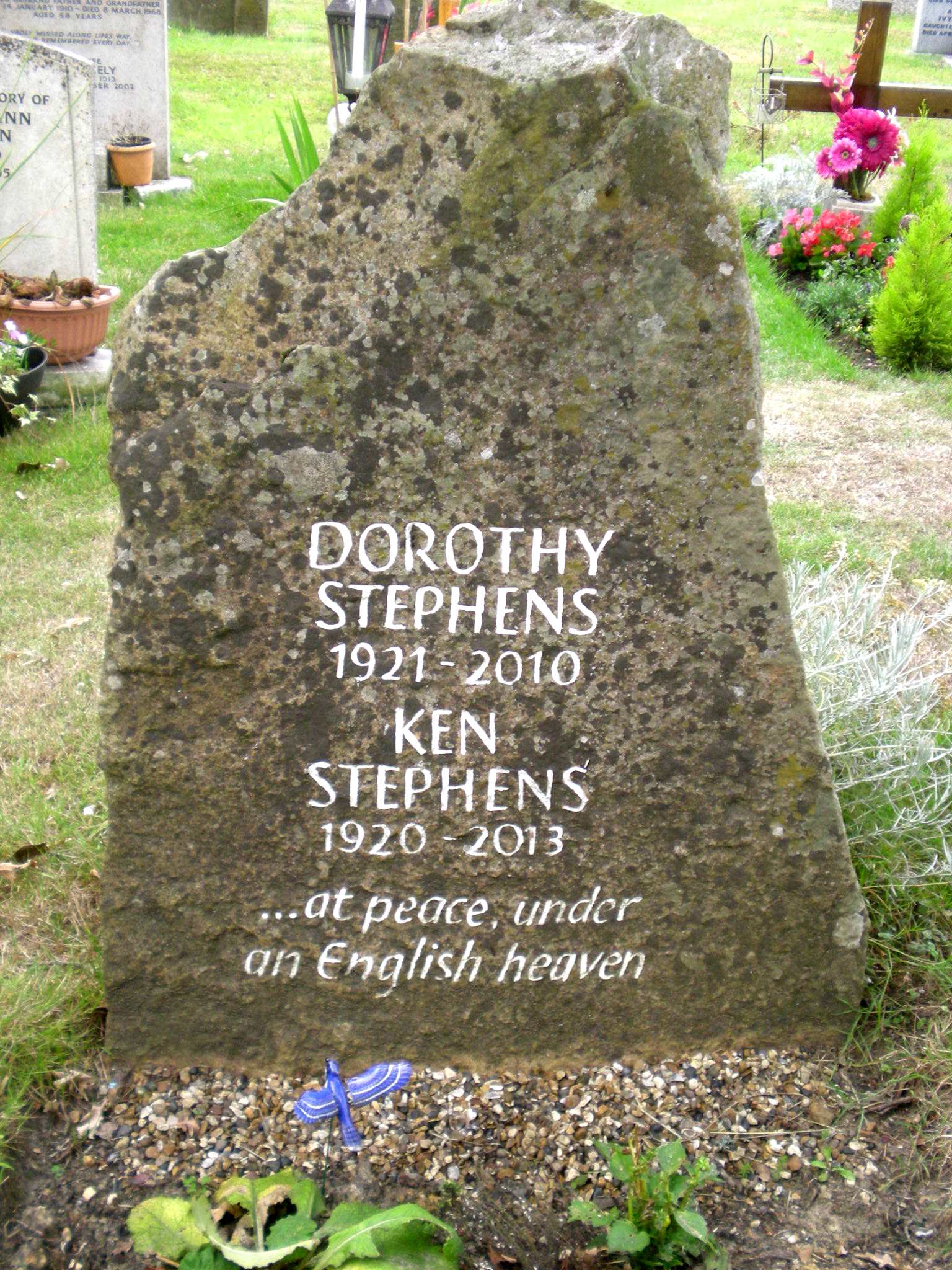 Headstone reads "Dorothy Stephens 1921 - 2010 Ken Stephens 1920 - 2013 At peace under an English heaven"