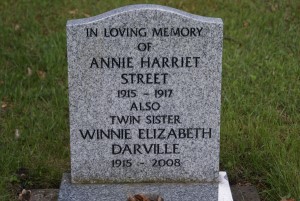 Headstone reads "In loving memory of Annie Harriet Street 1915 - 1917 also twin sister Winnie Elizabeth Darville 1915 - 2008"