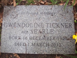 Headstone reads "In loving memory of Gwendoline Tickner nee Searle born 16 December 1920 died 1 March 2012"