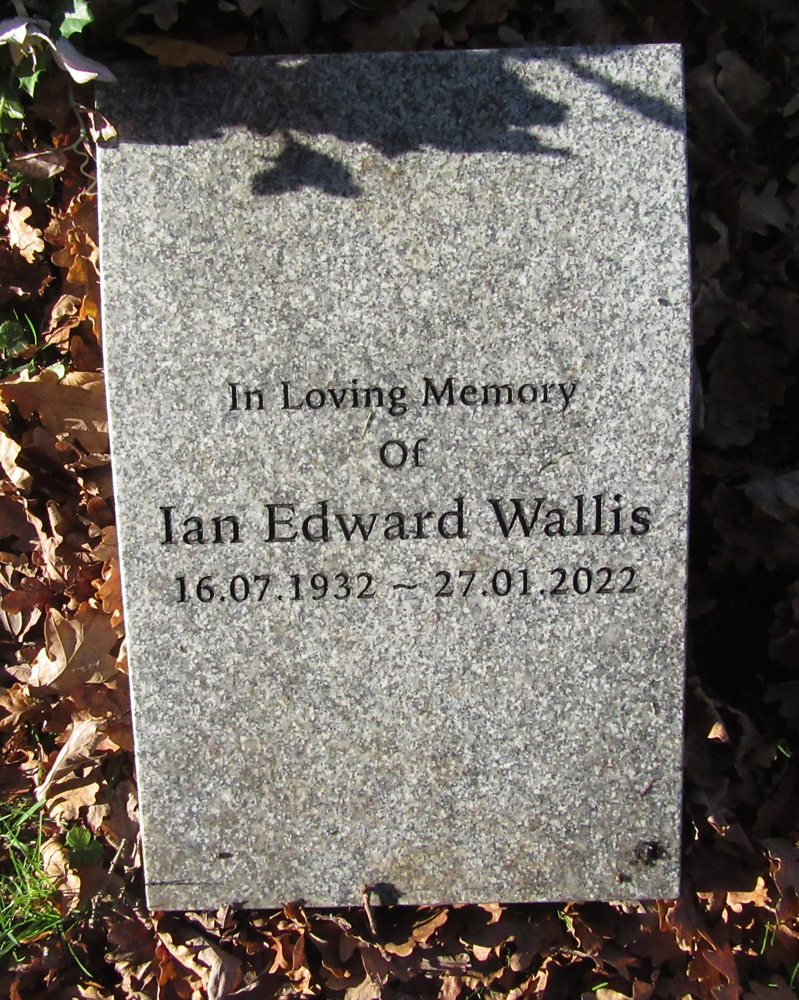 Headstone reads "In loving memory of Ian Edward Wallis 16.07.1932 - 27.01.2022"