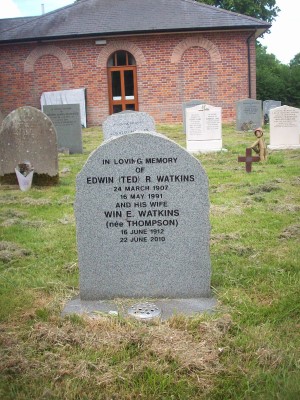 Headstone reads "In Loving Memory of Edwin (Ted) R WATKINS 24 Mar 1907 - 16 May 1991 and his wife Win E Watkins (nee Thompson) 16 June 1912 - 22 June 2010"