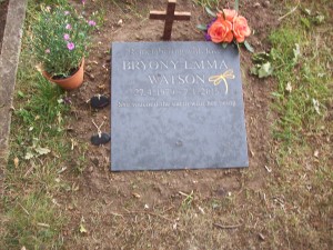 Headstone reads "Remembering with love Bryony Emma Watson 27.4.1979 - 7.1.2015 She touched the earth with her life"